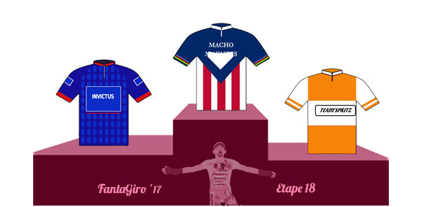 Au Fantagiro, ce sont évidemment les équipes ayant la paire Landa-Van Garderen qui se sont disputées la victoire. C’est finalement Macho Madness qui s’impose grâce aux points supplémentaires de Gaviria, Zakarin, Nibali et Quintana, alors que Invictus fait 19 points de moins avec Nibali, Pinot et Adam Yates. Team Spritz doit se contenter d’une troisième place, malgré une équipe comprenant Landa, TVG, Dumoulin, Kruijswijk et Zakarin. Quant à 1st Giro, il semble tout aussi inattaquable que Dumoulin. Avec presque tous les top-scorers dans sa team, il est tout simplement dans un fauteuil, même si Furupu Ichiban peut encore espérer que Thibot Pinot aille chercher l’exploit dans les prochains jours. Et attention, car la défaillance de Bob Jungels pourrait avoir une certaine importance au final.